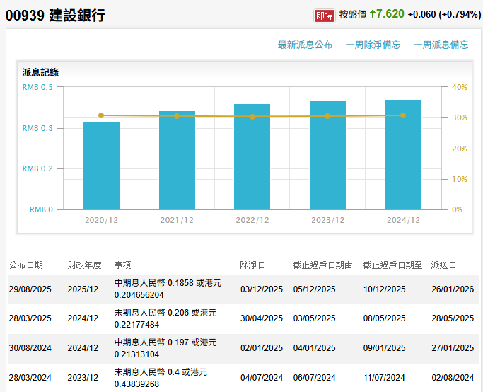 我們看到2025年中期股息是HKD 0.204656204,如果除以2025年8月29日股價 (HKD 7.51),股息率大概是2.73%,全年化回報大概是5.46% (2.73%*2),比2024年 (6.72%) 少了。