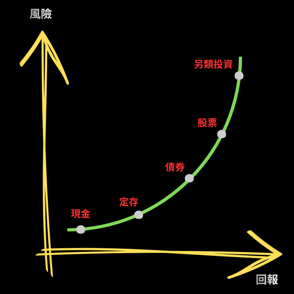 • 低風險、低回報 (Low Risk, Low Return): 債券、定存等,提供穩定但較低的收益,損失風險較小。